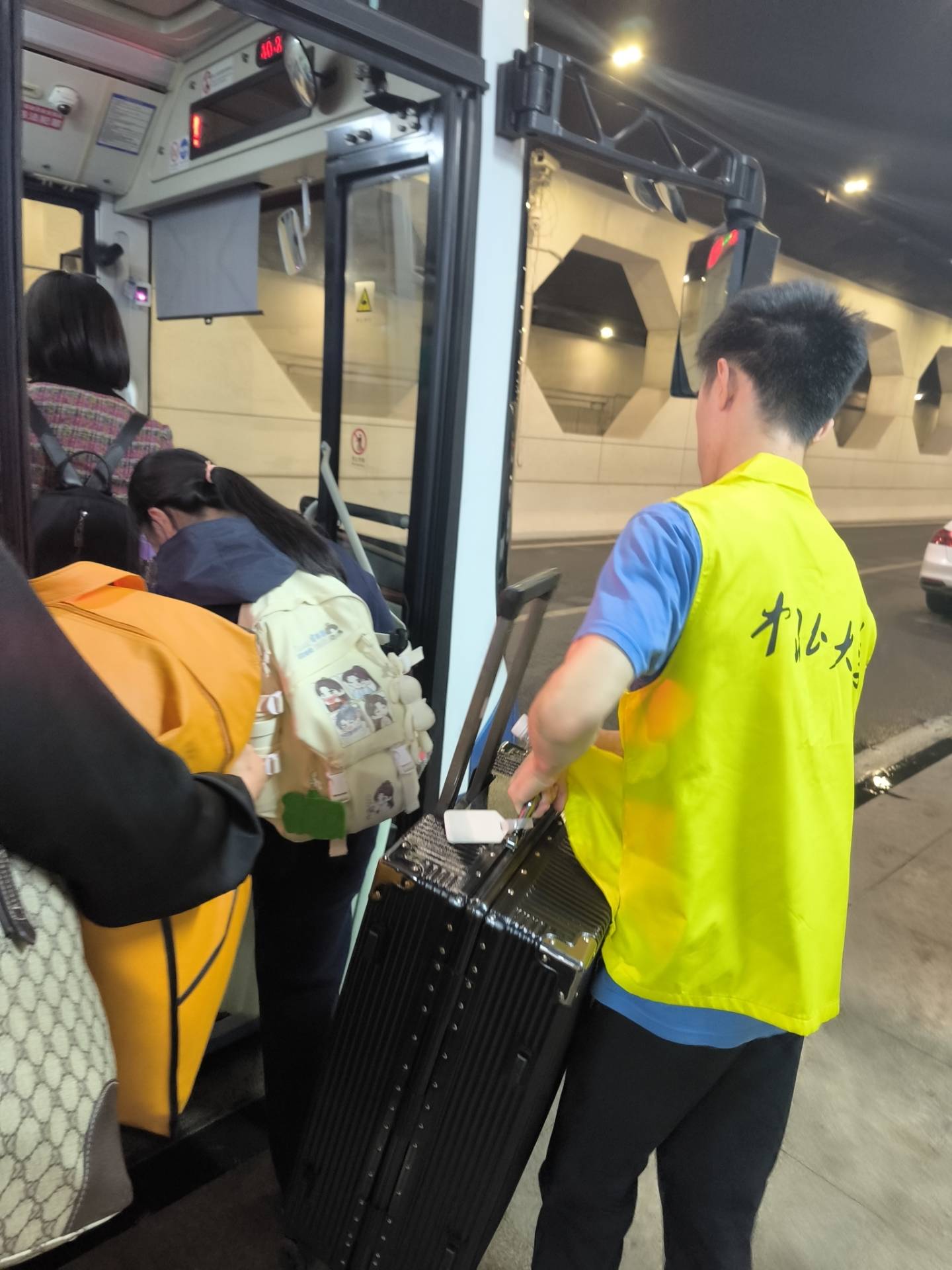 接站期间,学院郭达老师带领志愿者们坚守太原站接站服务点。每日清晨天微亮,志愿者们便已集合就位,他们身着亮黄色的工作服,手持醒目的学校接站牌,在出站口翘首以盼。志愿者们分工明确、默契配合,主动上前识别新生、热情引导至接待点、耐心解答疑问、协助搬运行李、引导新生及家长乘坐直达学校的迎新专车。一声声亲切的问候,一句句耐心的指引,一次次主动的援手,志愿者们用真诚的笑容和细致的服务,缓解新生及家长初次到来的陌生与舟车劳顿的疲惫。整个接站流程井然有序,高效顺畅。他们穿梭在车站的人群中,成为一道亮丽的“青春风景线”。