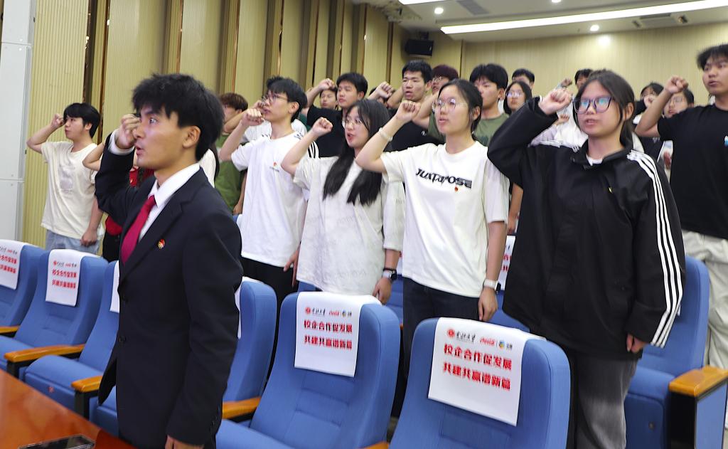 随后,大会举行了庄严的新团员入团仪式。老师们亲手为新团员授发团徽,在鲜红的团旗下,新团员们紧握右拳、以洪亮的声音庄严宣誓,以铿锵有力的誓言许下青春承诺。