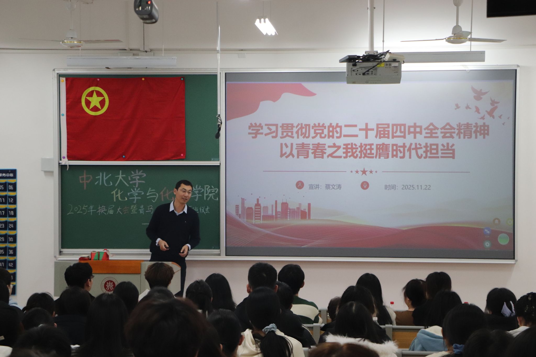 随后,蔡文涛结合党的二十届四中全会精神,系统解读会议系列核心关键词及背后的逻辑脉络,深入阐释学习全会精神的重要意义,并围绕全会提出的目标原则、战略要点展开细致讲解。他结合当前国际形势与中国发展的鲜活案例,精准剖析当代青年所处的历史方位——既身处百年未有之大变局,也站在民族复兴的关键节点,激励学员们务必胸怀“国之大者”,在时代浪潮中保持战略定力,将个人理想追求深度融入国家发展洪流。立足化学与化工学科特色,蔡文涛对学生们提出针对性要求。他强调,化工学科是国家实体经济的重要支柱,也是科技自立自强的关键领域。青年学子要将创新精神注入专业学习全过程,主动探索人工智能等前沿技术与化工领域的跨界融合,在绿色化工、新材料研发等关键赛道上找准发力点,以专业所长服务产业升级,用创新成果回应时代需求。告诫学生要以信仰铸魂,以本领强身,以奋斗圆梦,希望大家牢记青年一代的历史担当,在理论学习中坚定信念,在实践锻炼中增长才干,努力成为政治坚定、本领过硬、勇于担当的新时代青年骨干。整场培训节奏紧凑、内容充实,学生们专注聆听、积极互动,不少学生表示,此次培训既让自己对国家发展脉络有了更清晰的认识,也进一步坚定了作为学生骨干的使命担当。