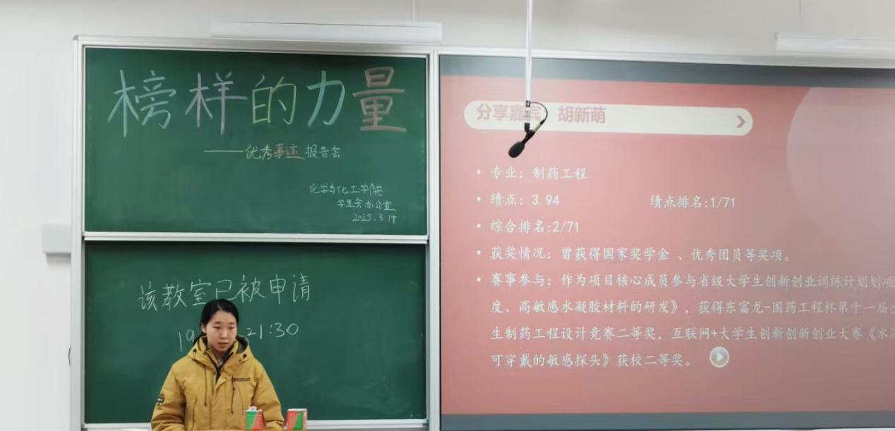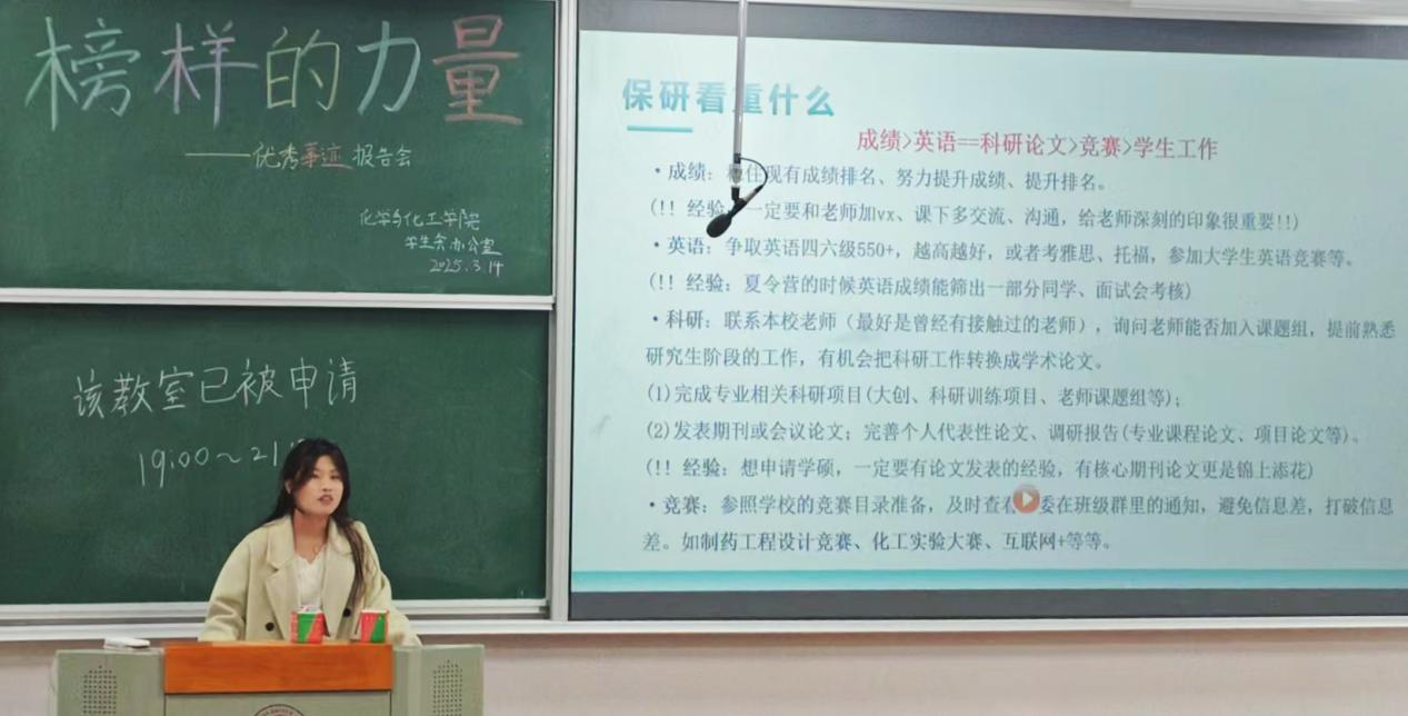 学生会办公室举办了以“榜样的力量”为主题的优秀事迹报告会,为在校生搭建与榜样对话的桥梁。报告会邀请了胡新萌、胡馨月和王笑涵三位成功保研的同学,分享她们保研的亲身经历与实战经验,助力学子们开启研途征程。