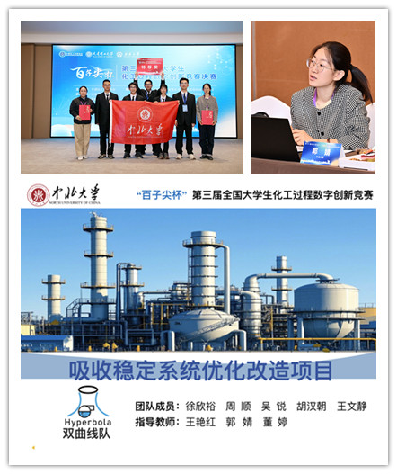 本次竞赛围绕“吸收稳定系统优化改造项目“,分别开展了数字建模、图形组态、操作验证的三项测试,着重展示动态控制和组态建模的实操能力。在校领导、教务处、创新创业学院、学院领导的大力支持下,经过近8个月的认真备赛,通过校赛选拔,国赛网评与线下全国总决赛的激烈角逐,我院由化学工程与工艺、能源化工专业学生组成的“双曲线”团队(团队成员:徐欣裕、周顺、吴锐、胡汉朝、王文静)以网评第一的优异成绩成功进入全国总决赛,并以总决赛小组赛第一的成绩成功进入总决赛二轮比拼,经过激烈的角逐,最终获得第三届全国大学生化工过程数字创新竞赛全国总决赛特等奖。