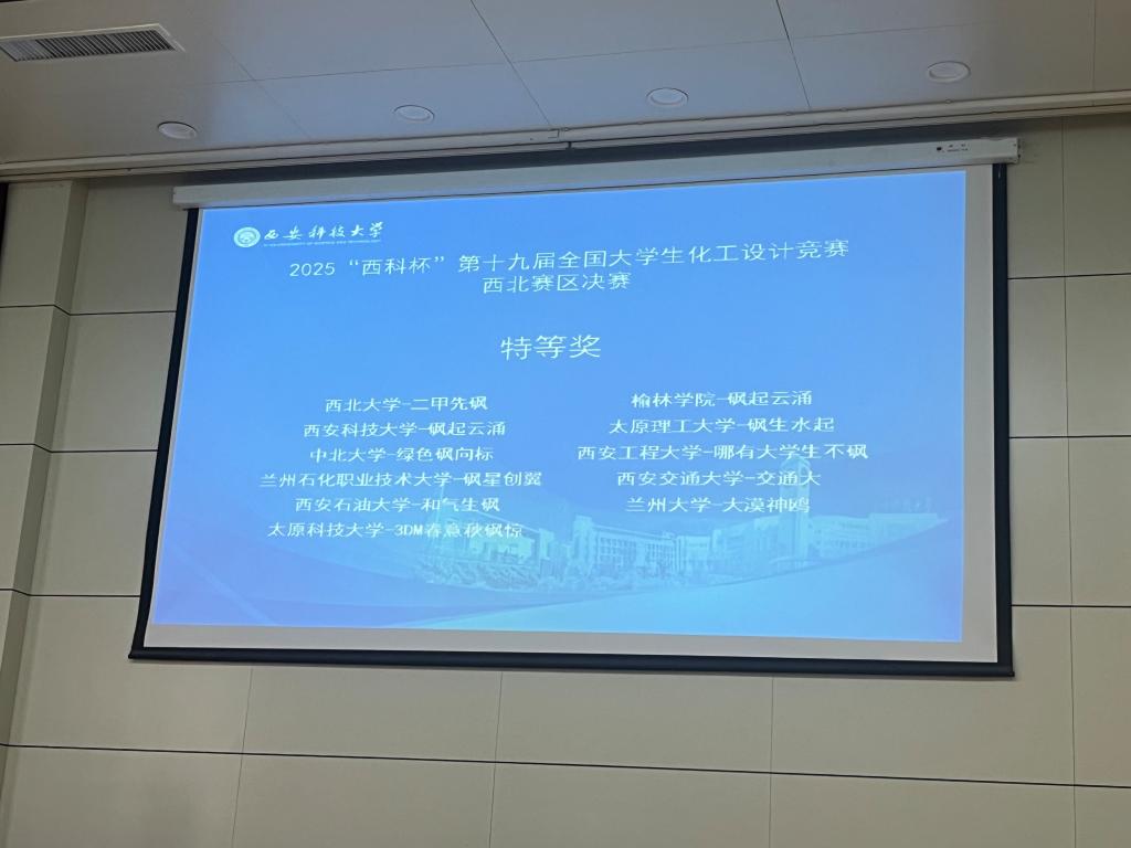 “绿色砜向标”团队凭借过硬的化工设计实力、出色的现场答辩、精彩的团队协作及现场应变能力,在西北赛区总决赛中以总分第三的优异成绩获得西北赛区特等奖,同时获得优秀“工程图纸”专项奖,并将代表西北赛区到天津大学参加全国总决赛。