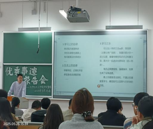 来自22级制药工程专业的国家奖学金获得者李玉豪,以4.13的GPA和国家级竞赛奖项,展现了卓越的学术追求;以90小时的志愿服务,彰显新时代青年的社会担当;他重点分享了在参与实验研究及竞赛过程中所遇到的困难、解决问题的过程等方面的宝贵经验。21级化工专业成佳璐,以4.313的学分绩点稳居专业第一,累计斩获15项荣誉奖项与4项国家级竞赛奖项,并成功推免至中国科学院大学攻读硕士学位,她热情分享了自己在学习、竞赛、学生工作方面的付出与努力,为同学们提供了宝贵经验。已考取西安交通大学研究生的张博恒,以清晰的逻辑分享了考研全流程经验,从择校策略、自律管理到资料准备,详细解析了每个阶段的关键点,强调“规划先行”的重要性。